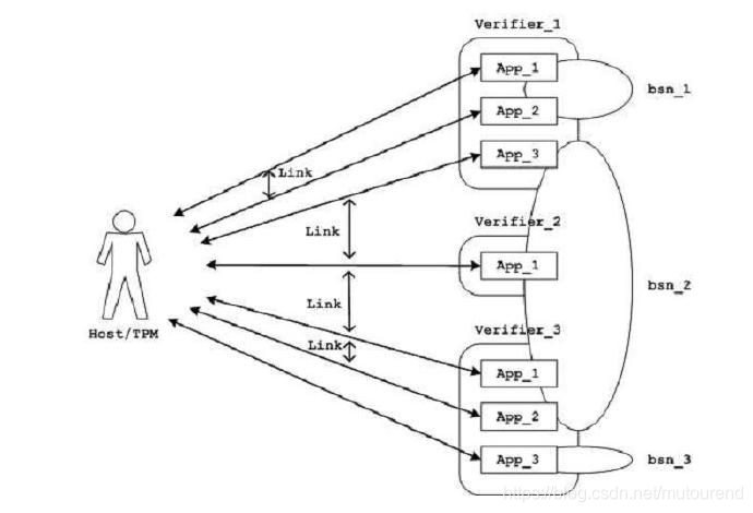 该图中我们可以看到,对于不同的几个服务器上的同一种应用且基于同一个bsn的签名是可关联的。一旦,服务器对该用户提供的某一个应用服务终止,例如Verifier_1上的App_3,那么与该应用相关的其他应用也会同时终止,例如Verifier_2上的App_1以及Verifier_3上的App_1和App_2。其具体实现的方法,在DAA协议构建的方案中可以看到。